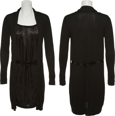 Kerisma 2fer dress takes on the appearance of a long sleeve cardigan sweater layered over a dress. The outer-layer is constructed of a cashmere blend sweater knit fabrication with a shawl collar along the neck. The sateen under-layer is finished with a rib knit along the neckline, accented with large black faceted beads. The waist is accentuated with a narrow, black patent adjustable belt. Measures approximately 36" long from shoulder to hem.